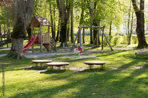 Spielplatz Gras Sonnenschein Rutschbahn Holz Schaukel